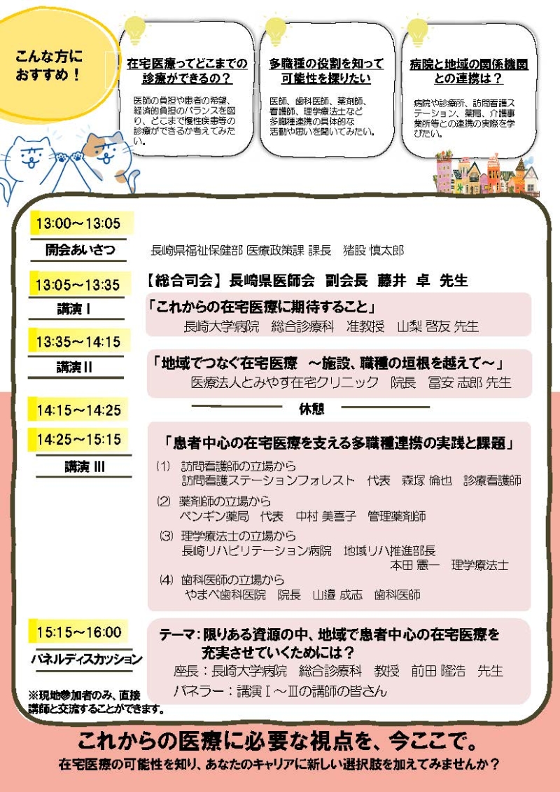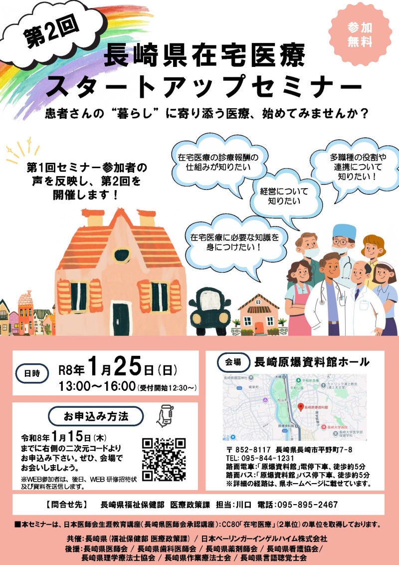 2026年1月25日(日) 第2回長崎県在宅医療スタートアップセミナーにおいて、当科の前田隆浩教授が座長、山梨啓友准教授が講演の講演を務めます。在宅医療に関心のある皆様のご参加をお待ちしています。日時:2026年1月25日(日) 13:00~16:00会場:長崎原爆資料館ホール